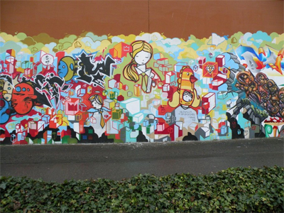 bart & i spent saturday afternoon in georgetown; i have wanted to see the graffiti wall for some time & he's been hoping to check in at fantagraphics. as we were looking for the wall, i thought to myself, "this is going to be one of those things that i build up, only to be let down." i was happy to see that the wall is full of bright colors, careful artwork & fun characters. we also had a great time visiting with larry, a long time fantagrapher that offered us tons of input & stories about the books & the artists.